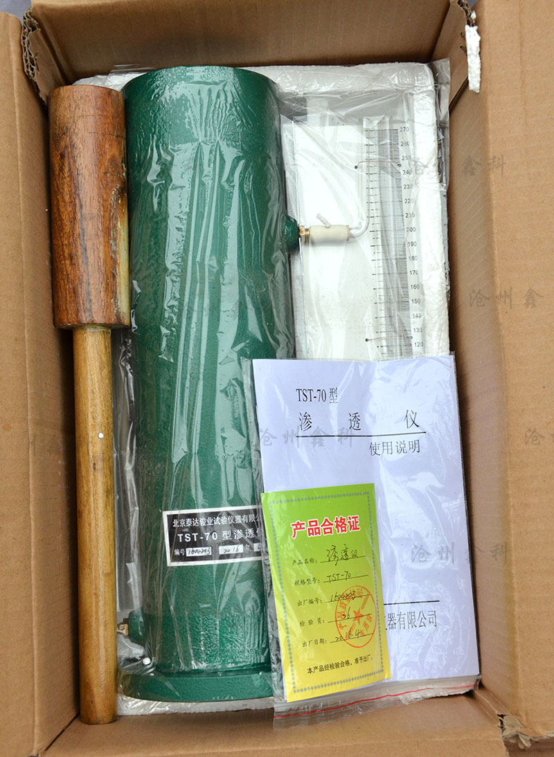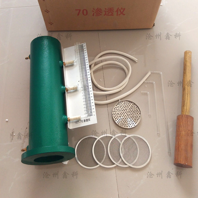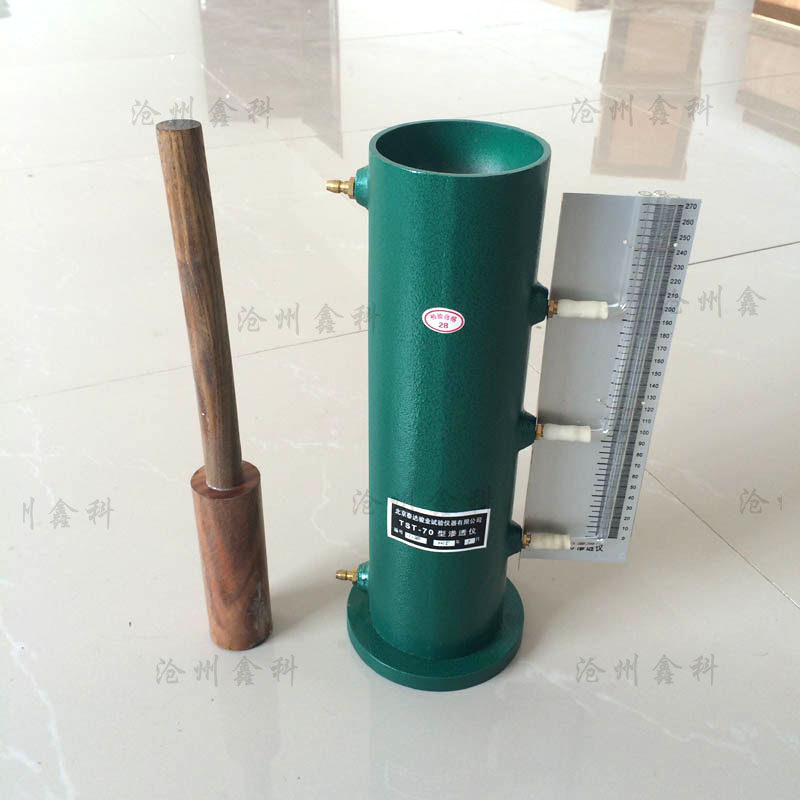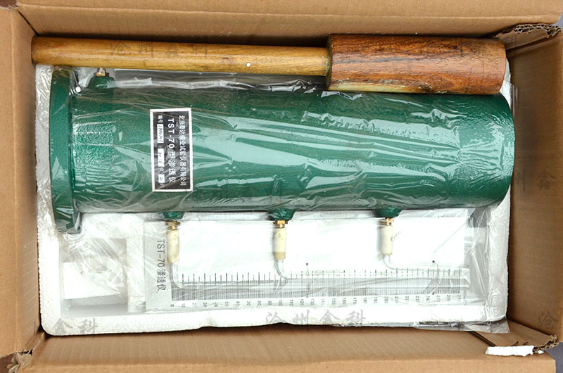 滲水部件由筒身、滲水板、刻度板、測壓管等組成,在刻度板上裝有三個測壓管,其間距為100±0.44mm,水位的測讀可由安裝在筒上的刻度板的刻度讀出,測壓管接頭內(nèi)均裝有銅絲布以防止細砂粒在試驗時隨水流出。滲水筒下部有一排水孔,松開螺栓即可放出污水。擊實部分備有木錘,以擊實試樣。本儀器設(shè)計制造符合(GB9357-77)標準,符合《土工試驗規(guī)程》(SL237-1999)《公路土工試驗規(guī)程》(T0129-93)中的砂類土及含少量礫石的無凝聚性土在常水頭下進行滲透試驗。